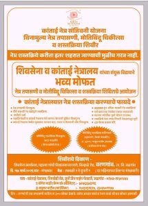 १. मोफत शस्त्रक्रिया: SICS पद्धतीने (विना घडीची लेन्स) मोतीबिंदू शस्त्रक्रिया पूर्णपणे मोफत केली जाईल.